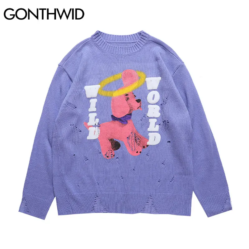 Special Offer Свитер GONTHWID в стиле Харадзюку, уличная одежда, с мультяшным принтом собаки, потертый вязаный джемпер с дырками, повседневная трикотажная од... Discount (50%OFF) Today!